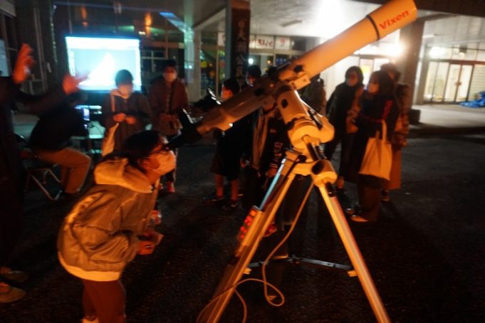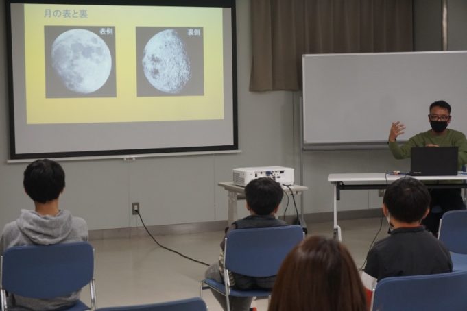 11月21日(土)に天体観測をしました。講師は公民館運営事業団事務局員の荒倉主事と前津江公民館の塩川主事です。最初に荒倉主事より星の話をしていただきました。いつも見ている月の裏側は表側とは違い、ボコボコしていて、表と裏では随分違うんだなと感じました。