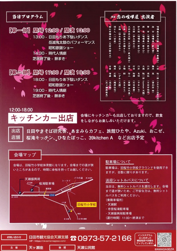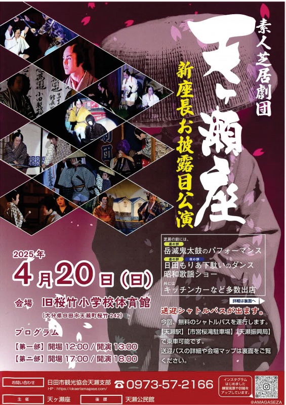 4月20日(日)、旧桜竹小学校体育館にて「素人芝居劇団 天ケ瀬座」の公演が行われます。天瀬公民館も後援してます。