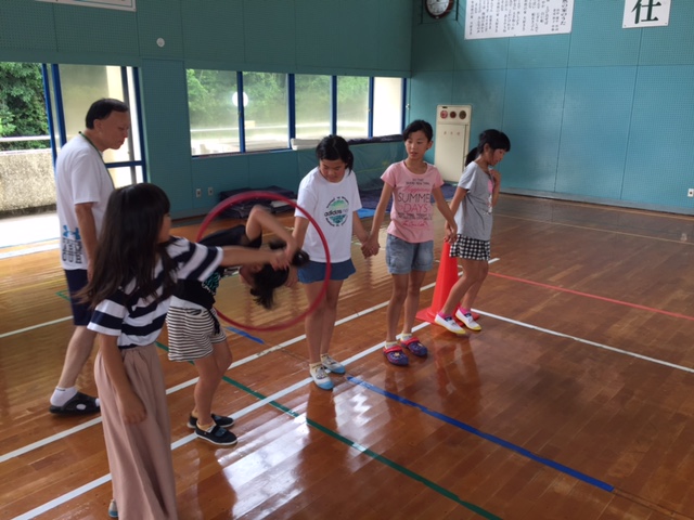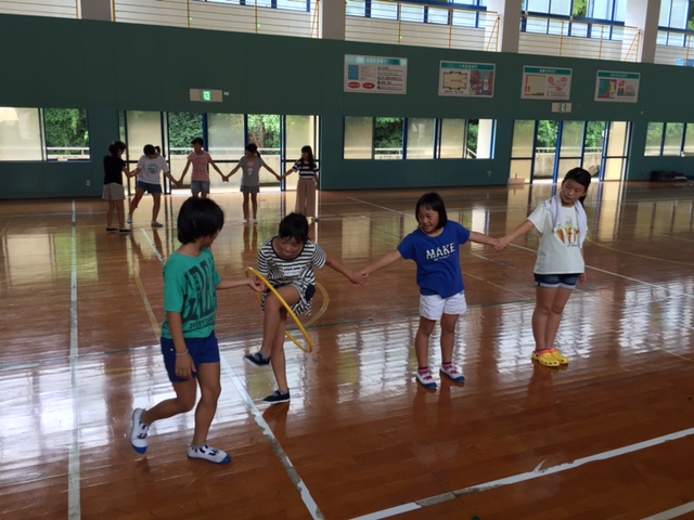 フラフープくぐって前に進んで競争するものです。