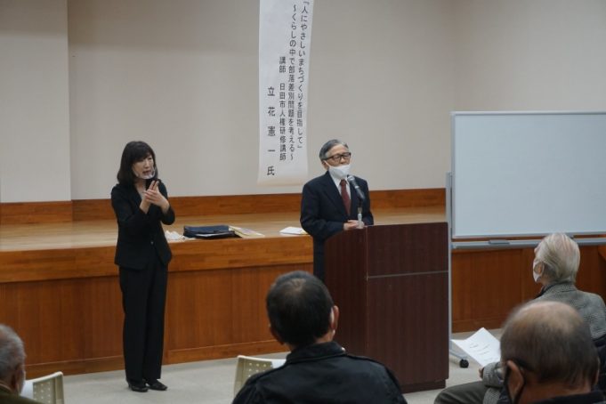 12月3日(木)に天瀬町人権講演会を開催しました。講師に日田市人権研修講師の立花憲一さんをお招きして、「人にやさしいまちづくりを目指して~くらしの中で部落差別問題を考える~」と題して講演をしていただきました。