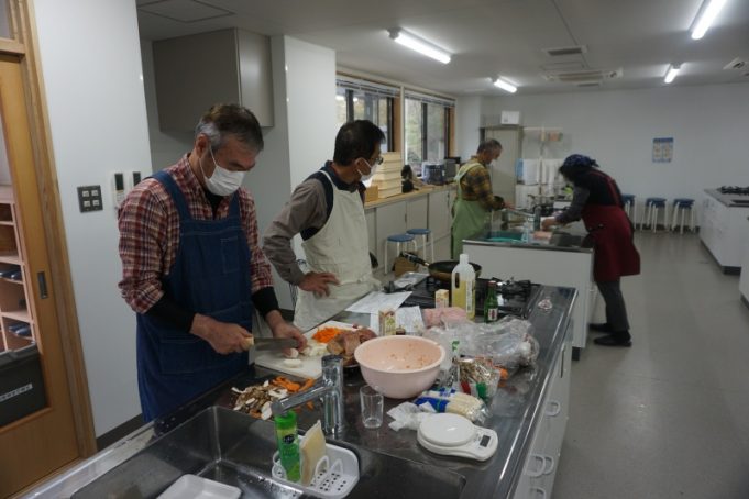 今回のメニューは魚の甘酢あんかけ、レンコン餅、きのこの豆乳スープ、リンゴきんとんです。外は雪が舞ってとても寒い日でしたが、皆さん料理に集中していました。