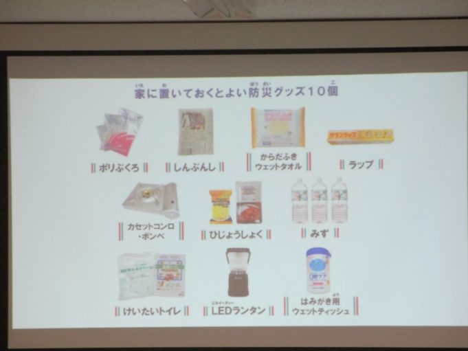 自然災害に対しての心構えや備えておくと便利な防災グッズなどを紹介していただきながら、途中に防災に関する創作落語を披露していただきました。