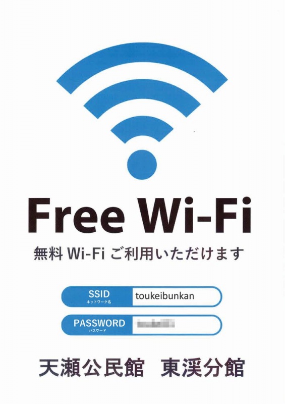東溪分館をご利用する方でしたら、どなたでもご自由に使えますので、公民館を利用する際には積極的にフリーWi-Fiをご活用下さい。