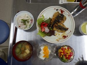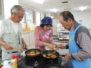 今回のメニューは「いわしの蒲焼」・「サラダもずく」・「牛乳寒天」・「梅じゃこご飯」・「厚揚げとなめこの味噌汁」の5品。先生の指導を受けながらテキパキと調理して1時間足らずで完成しました。