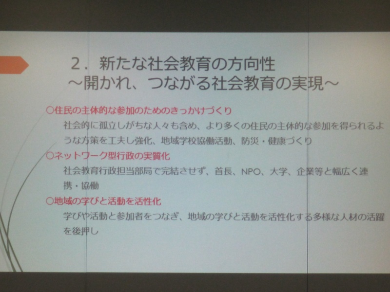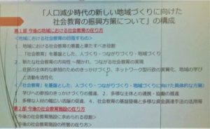 そして報告の中で、災害に対する公民館の役割の多くを占めるのは、住民の災害対応スキルを高め、防災・減災へとつなげる事。そしてそれは、公民館が持つ本来持つ「結ぶ」「繋ぐ」「学ぶ」の役割の中にある事。「これまで無かった災害がいつどこで起こってもおかしくない」からこそ、「日常の中に防災・減災意識を取り入れる」ことや、被害を拡大させないためには、公民館が、地域団体や、住民の活動を少なからず後方から支え創ってきた「居場所」や「繋がり」が重要であることを発表されました。