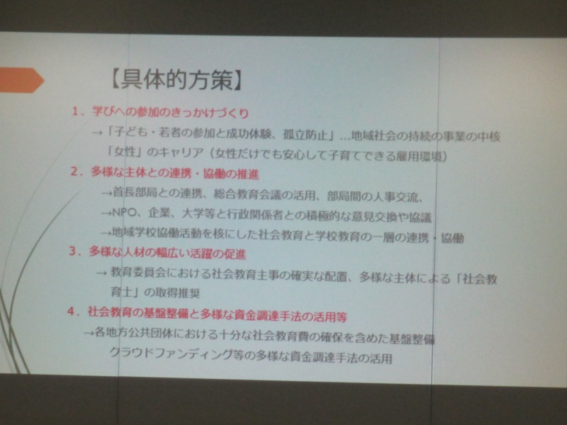 「‥‥・社会教育施設に関する事務について今後とも教育委員会が所管することが基本とすべきであるが、公立社会教育施設の所管については、当該地方の実情を踏まえ、当該地方にとってより効果的と判断される場合には、地方公共団体の判断により地方公共団体の長が公立社会教育施設を所管することができることとする特例を設けることについて、(中略)社会教育の適切な実施の確保に関する担保措置が講じらることを条件に、可とすべきと考える」