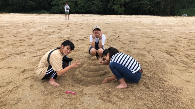 朝日の女子チームは、何かサンドアートを作ったようです。