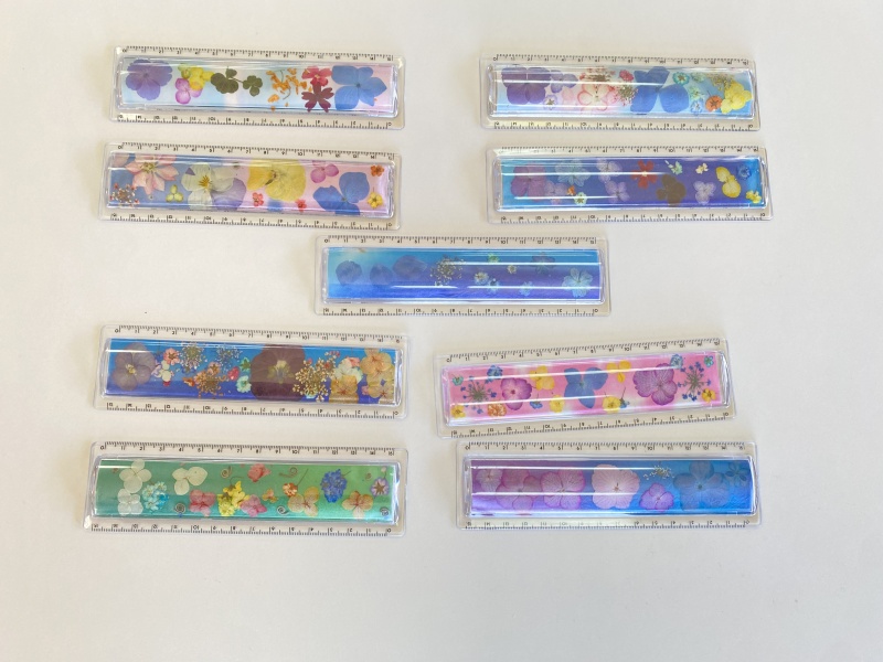 定規も、台紙に押し花を糊で引っ付けて。
