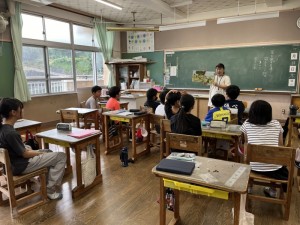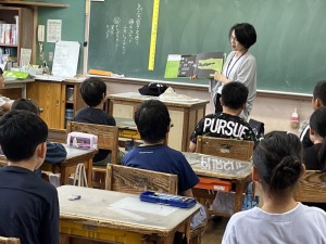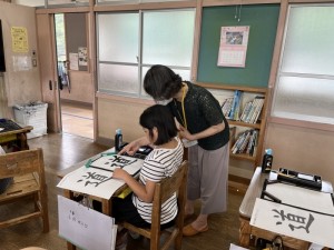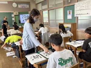 児童たちは、指導を聞きながら、一生懸命に書を書いていました。