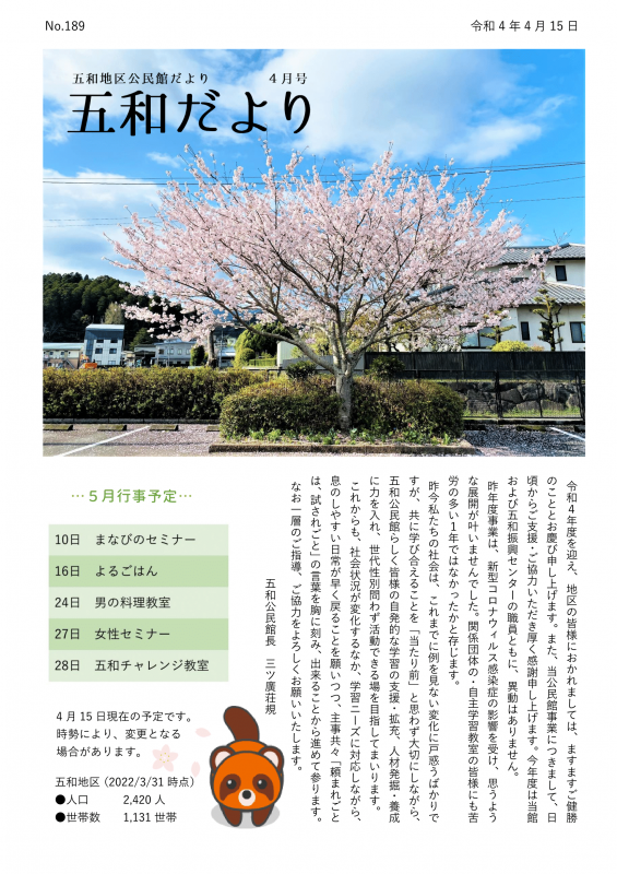 令和4年4月15日に五和公民館だより『五和だより』を発行いたしました。