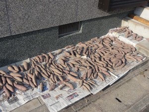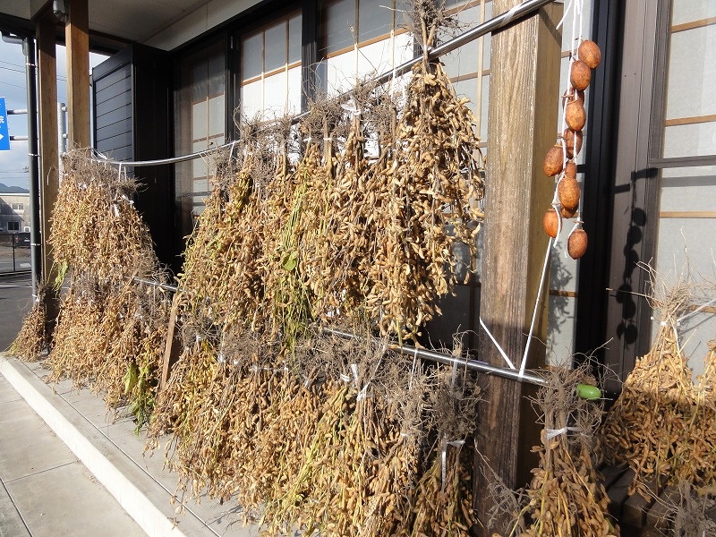 先日の大豆収穫後、公民館和室の縁に天日干ししてます。 住民の方からいただいた干し柿も吊るしました。 公民館とは思えない光景ですが、秋をしっかり感じることが できますね。 ついでに植えたサツマイモも小ぶりながらたくさんとれました!