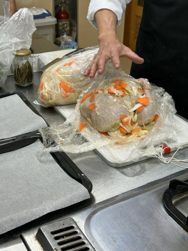 鶏一匹はセロリ、人参、玉ねぎなどの香味野菜で1晩マリネしておきます。