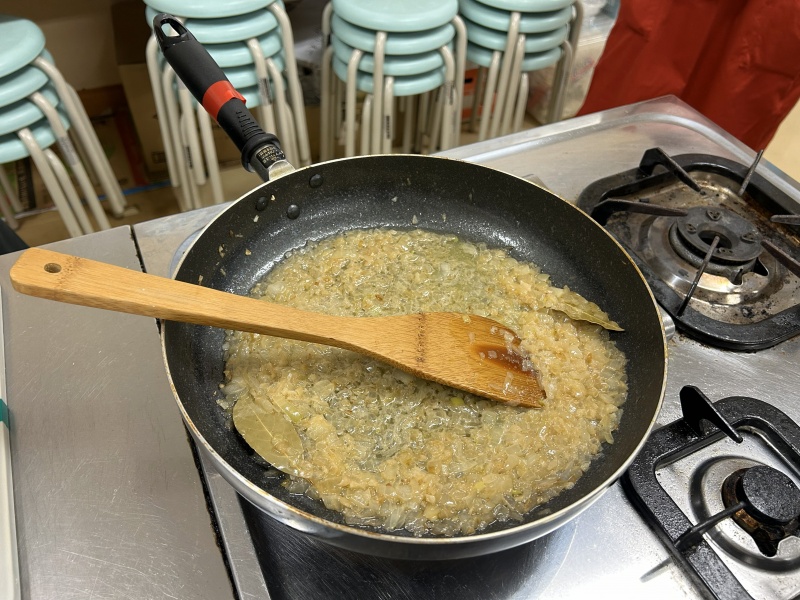 バターライスは、玉ねぎをみじん切りにして、たっぷりのバターとローリエを入れ