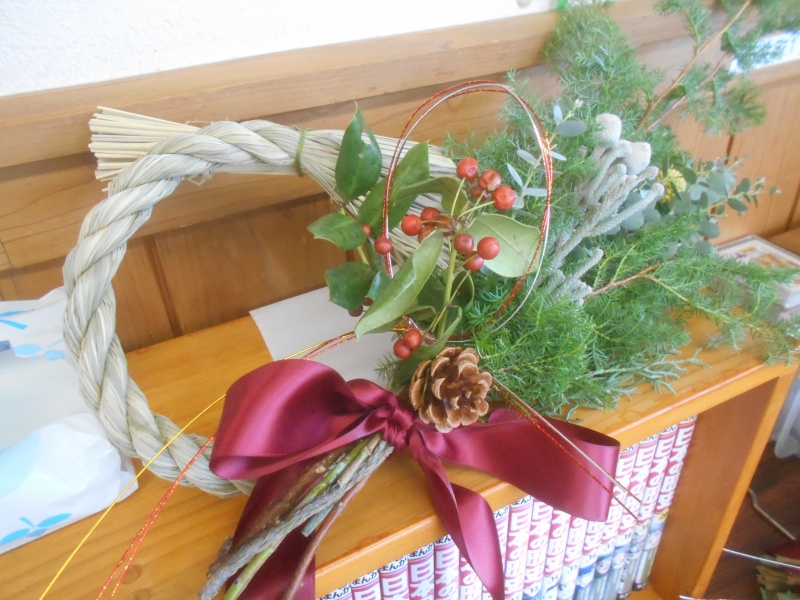 また、リースの土台は、しめ縄を丸い形に成形してあるものを使いました。