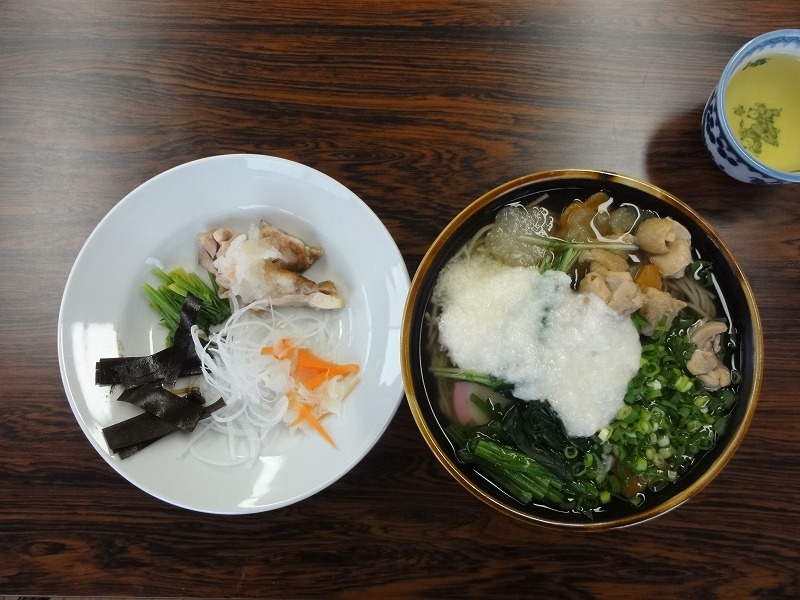 そばは、山芋をおろしてとろろに、鶏肉は甘辛く煮て、ほうれん草