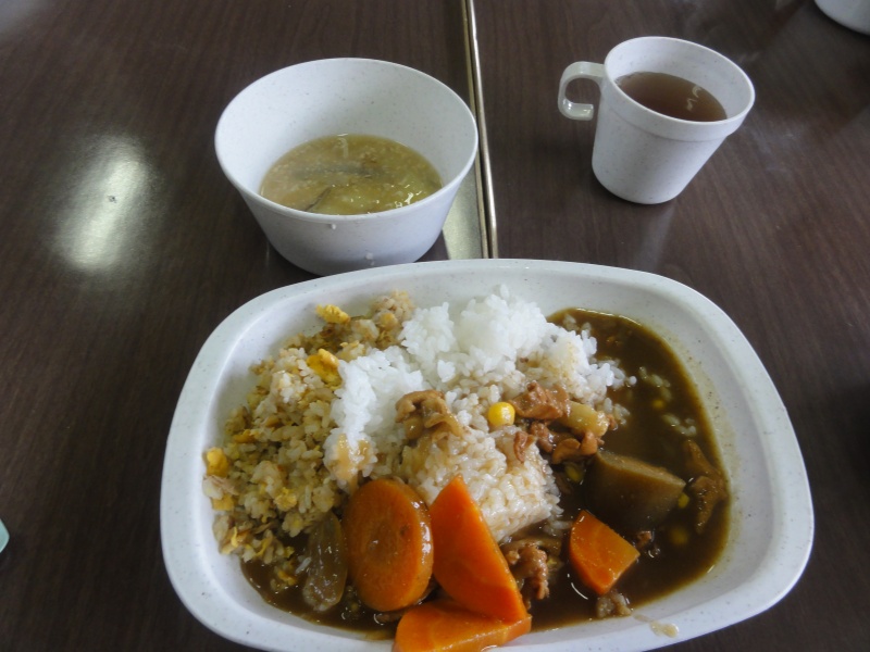 朝ごはん。味噌汁・カレー・チャーハンのセットです