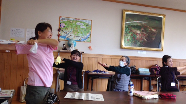 血圧測定のあと、今日はタオル体操です。頭の体操をして、石井小学校へミシンの指導に出かけます。今日も1日頑張りましょう〜