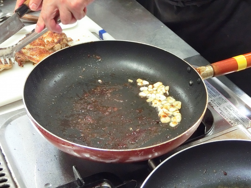 にんにくを焦げないように炒めております。油に香りを移してその油でソースを作ります