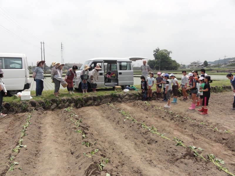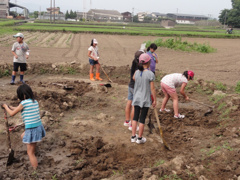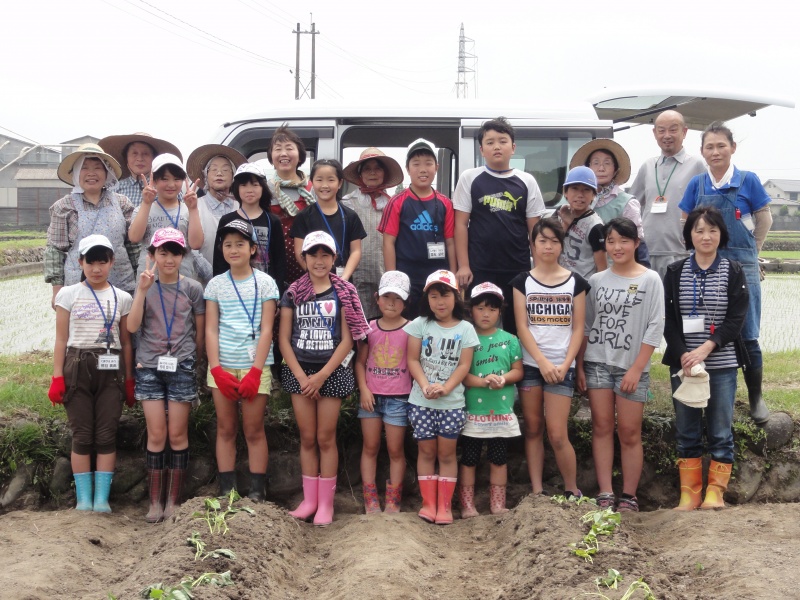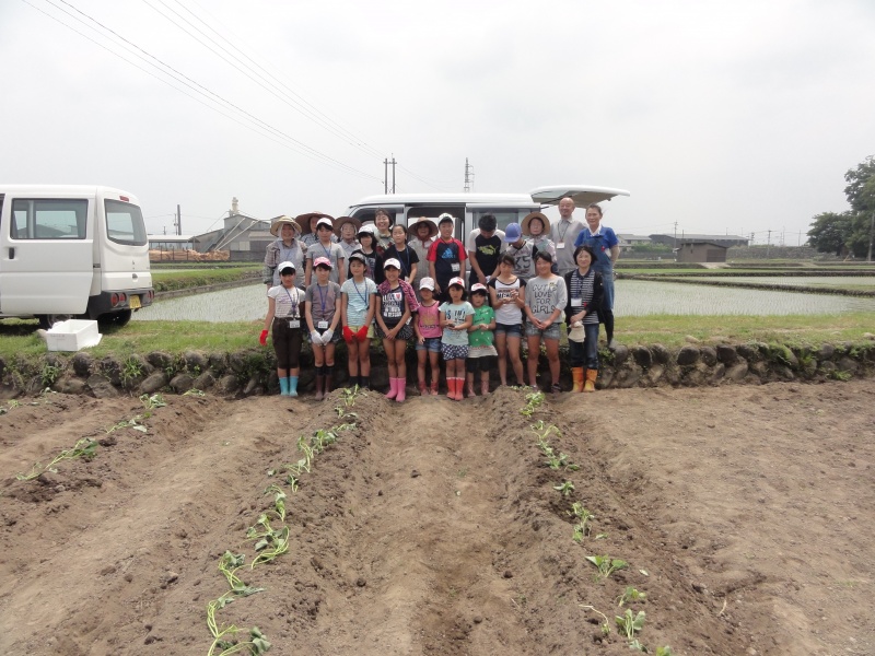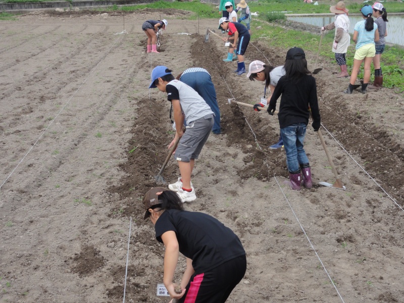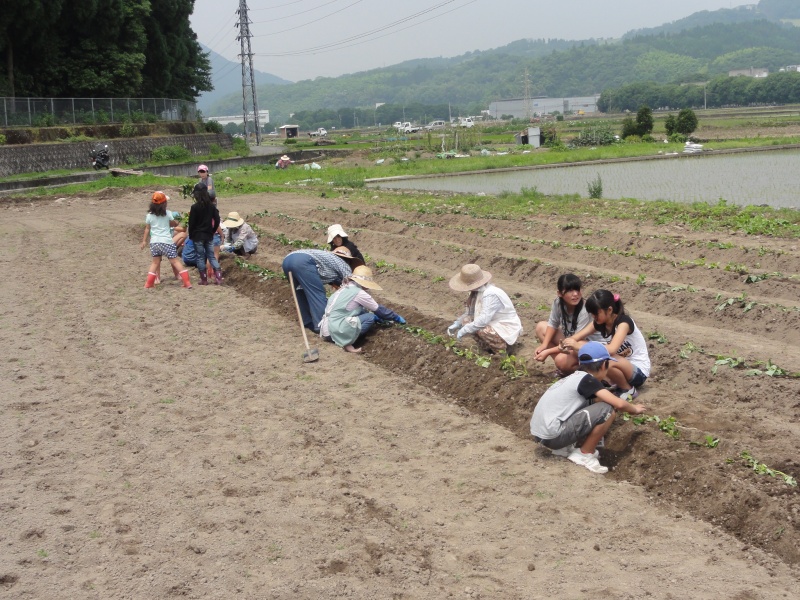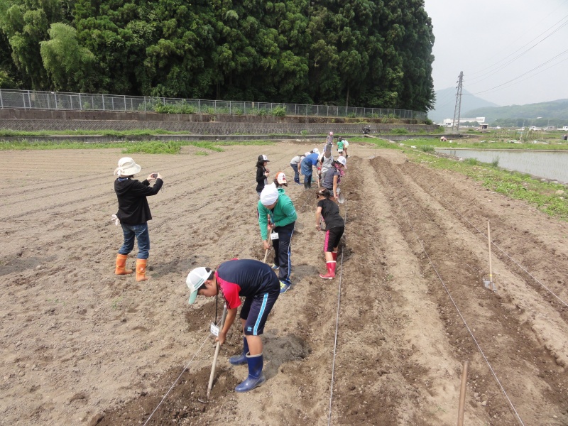 公民館の畑で、畝作り、水やり、芋苗植えをしました。