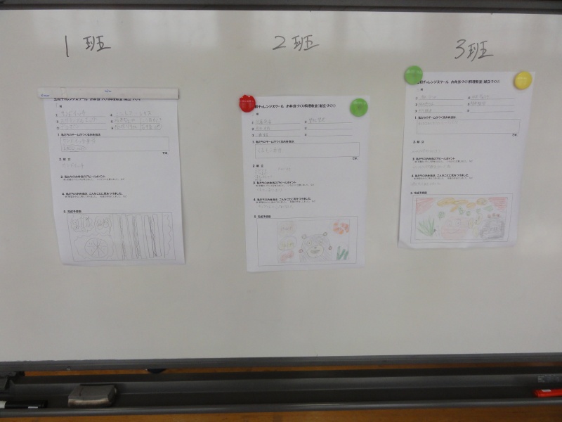帰って来て来週の弁当の献立決めを班ごとにして振り返りノートを書き終了しました。