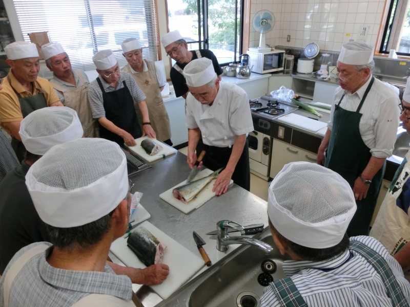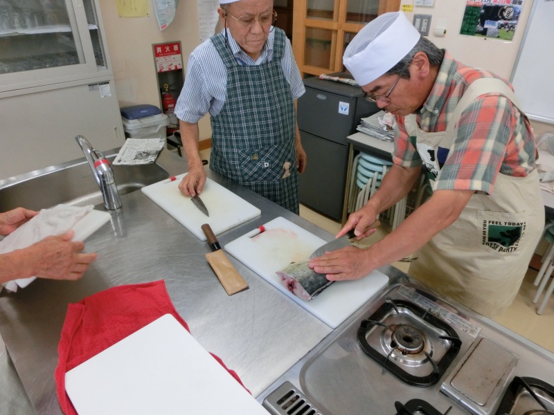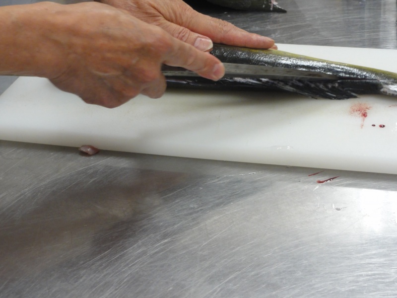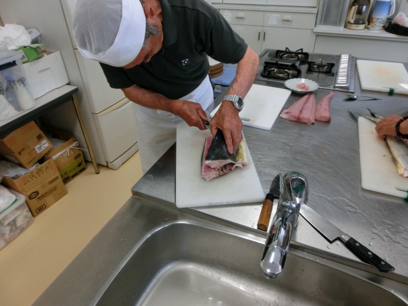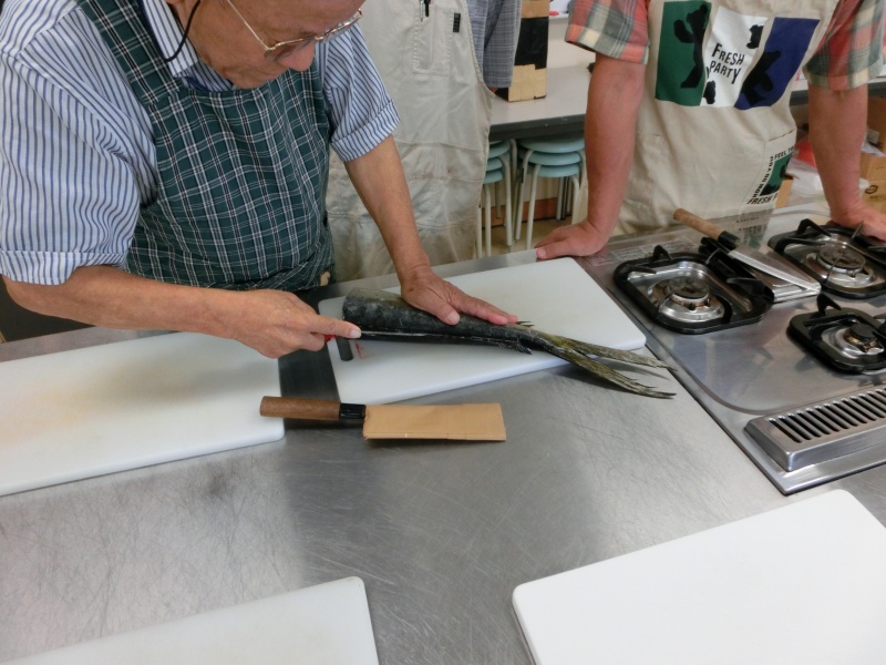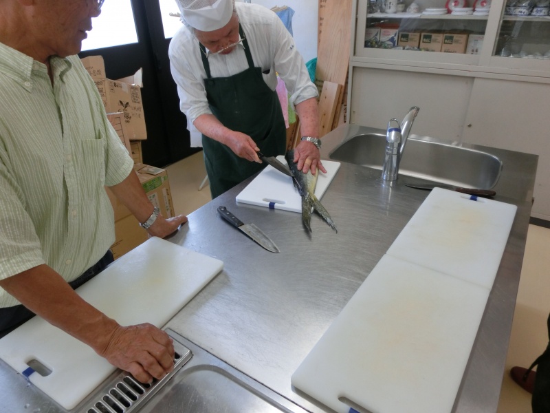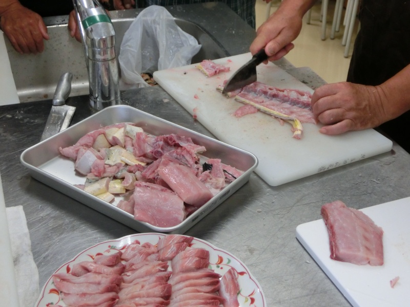 今日(21日)は2名欠席で13名でシイラの捌きを行いました。