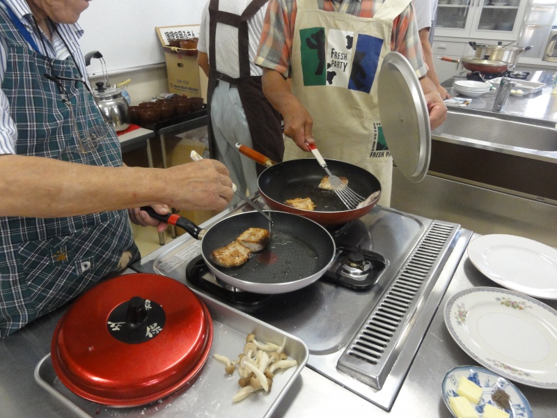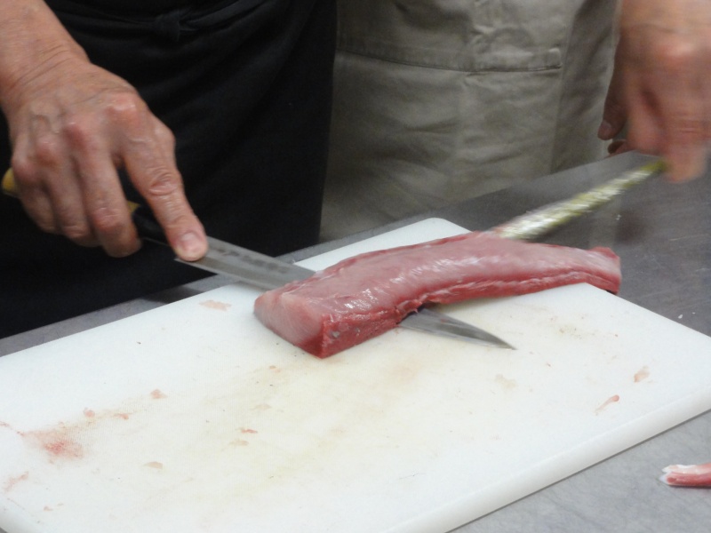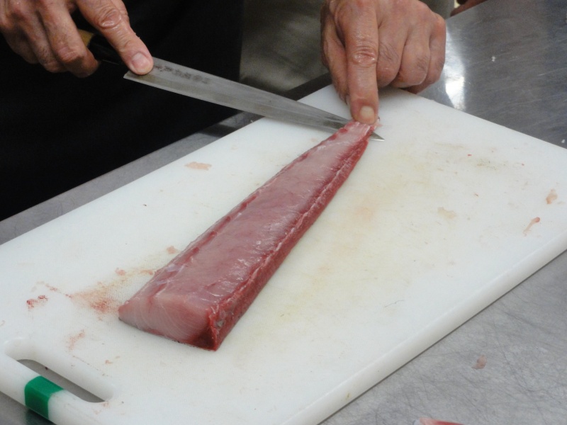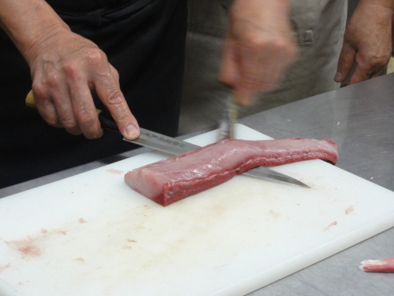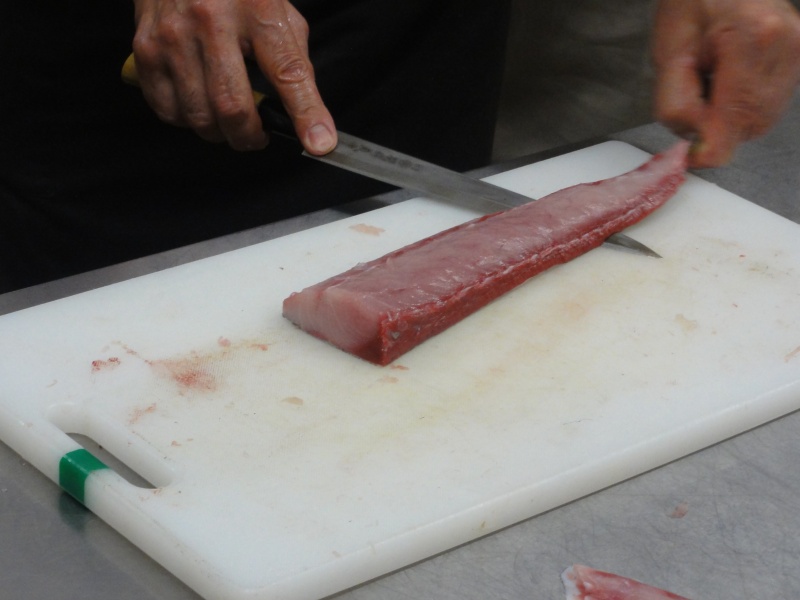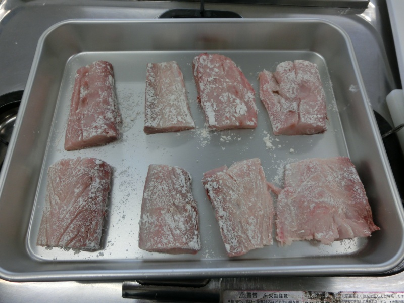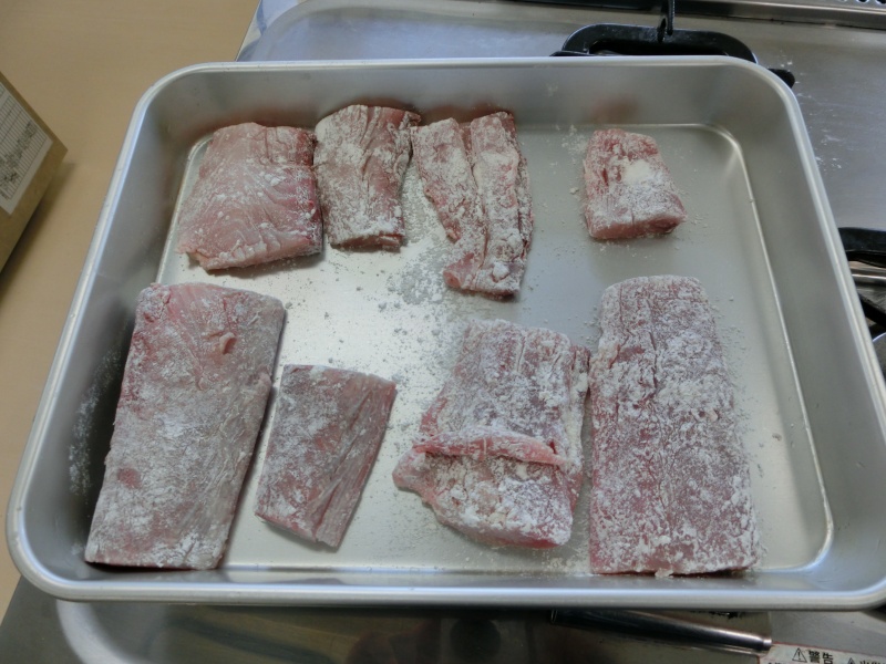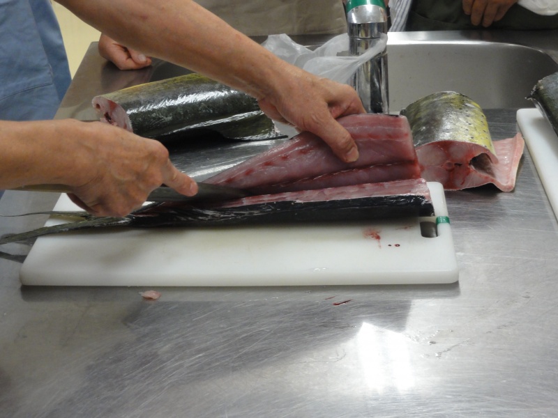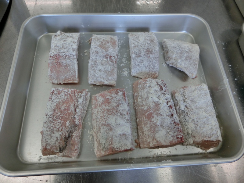 シイラに粉をふってます。どこの班が均等に切れてるかな??