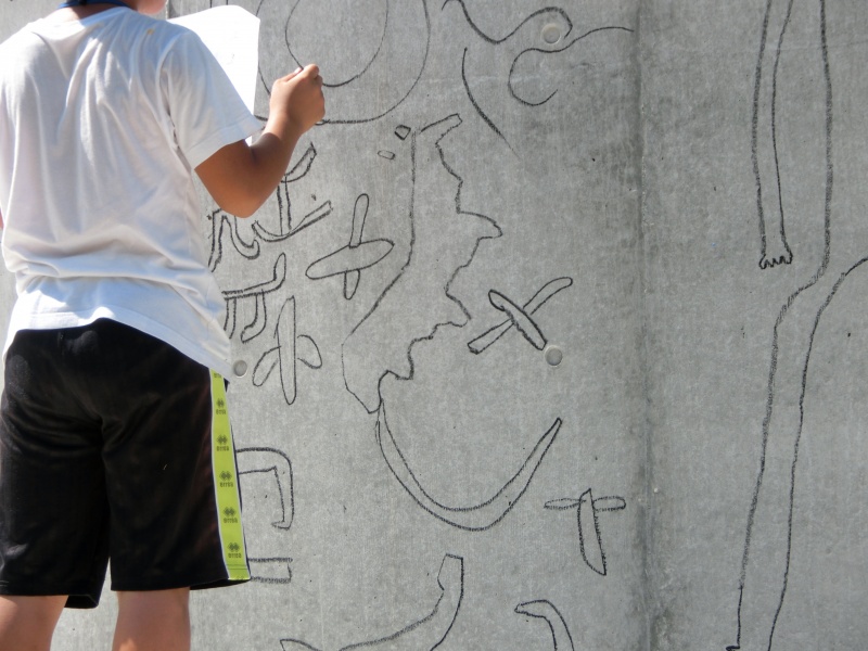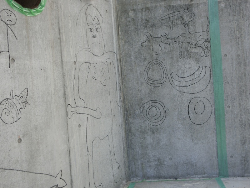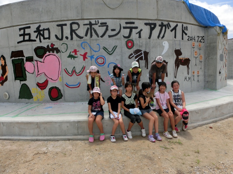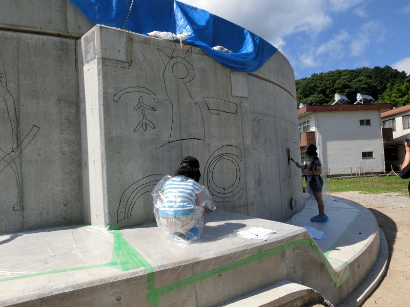 ガランドヤ遺跡の復元工事中のコンクリート壁面に、ごわジュニアボランティアガイド養成の生徒が