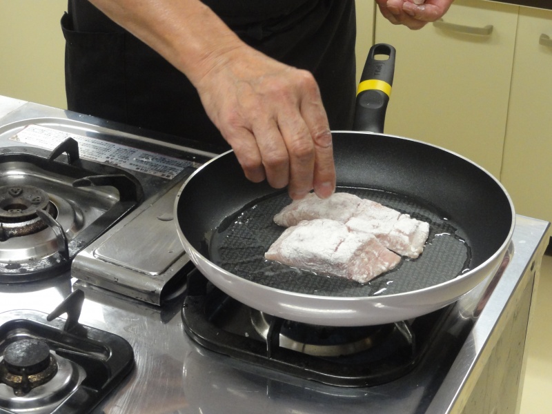 シイラを油で焦げ目がつくようにじっくり焼きます。