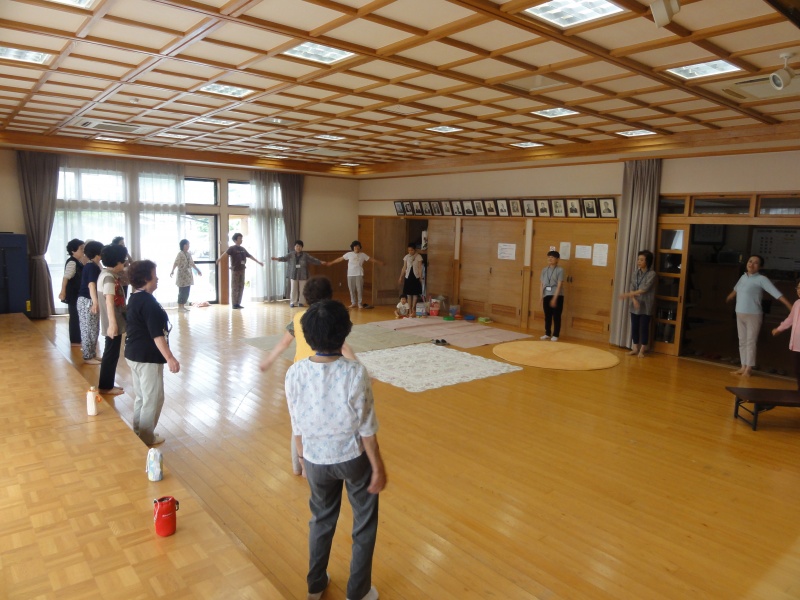 体操です。集会室が臨時福祉給付金の説明会場になったので狭い処でごめんなさい。