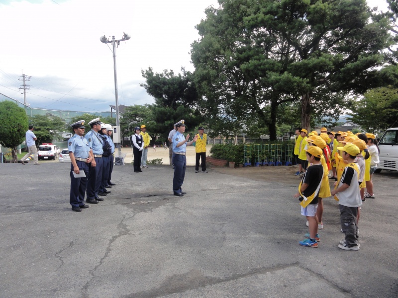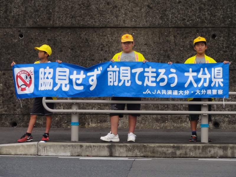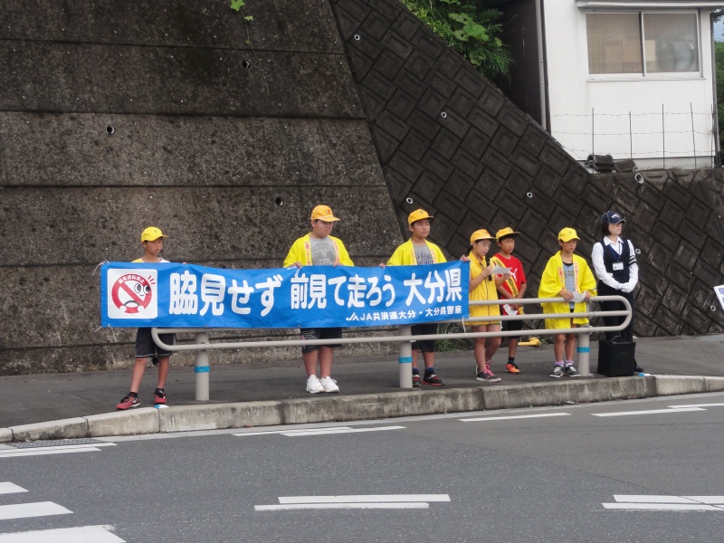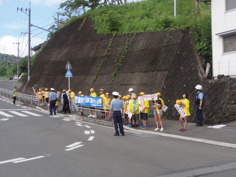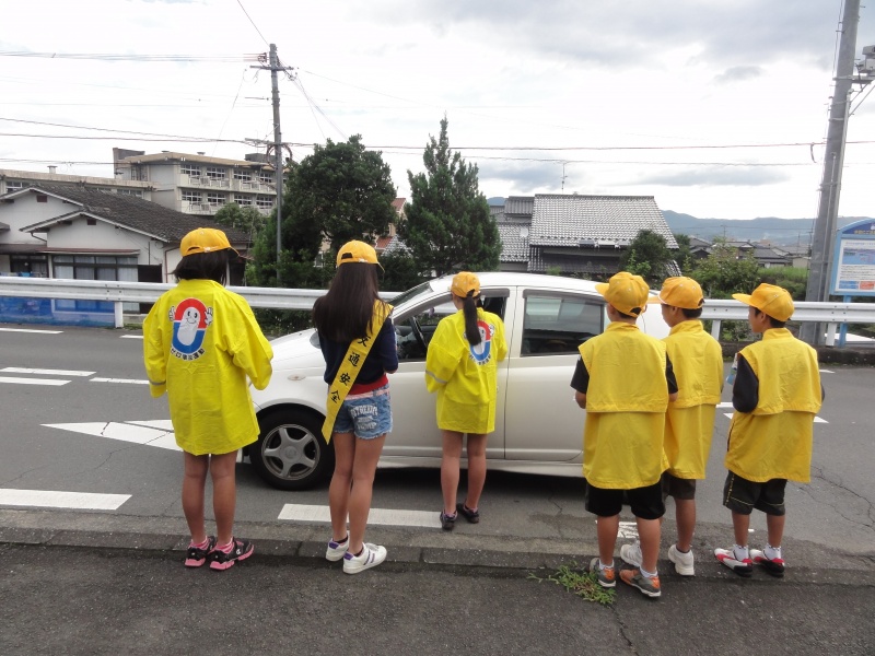 本日、7時30分より大分夏の事故0運動を石井小学校前でおこないました。日田警察署の方と石井小6年生、地区の交通安全協会の方々で