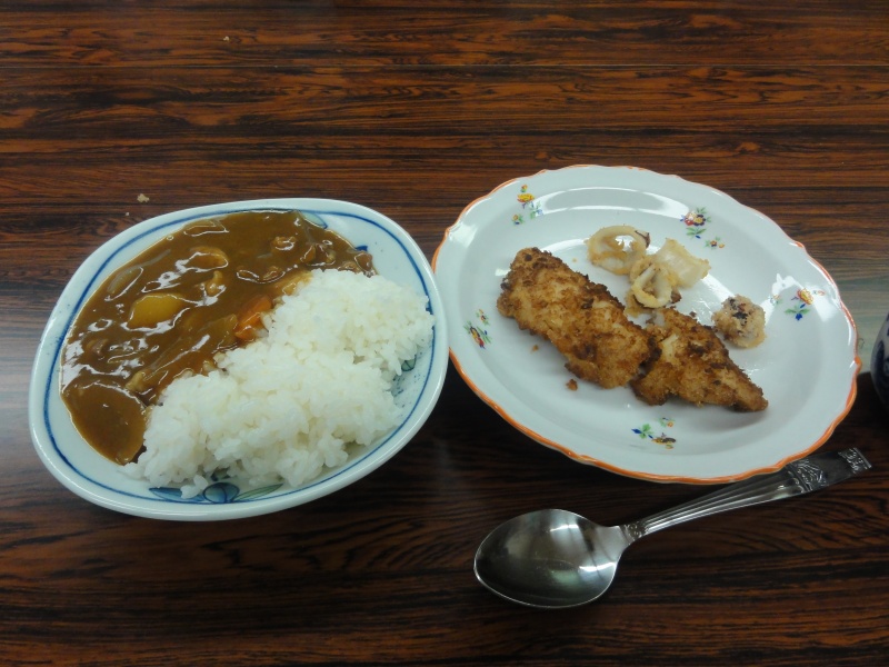 急遽作ったカレーと白身魚フライ・イカフライです。白身魚フライは美味しかったです。
