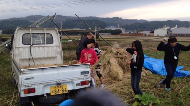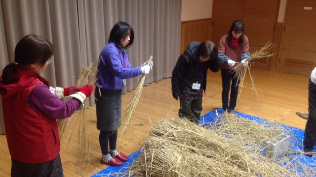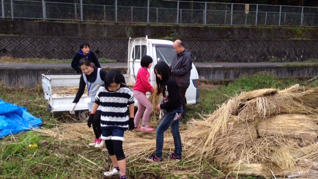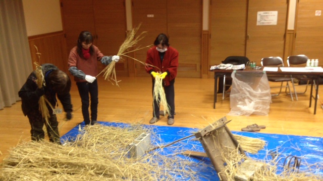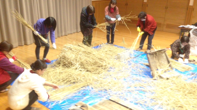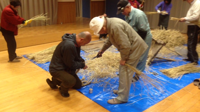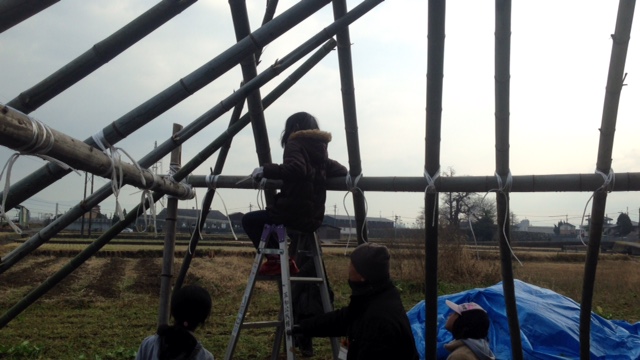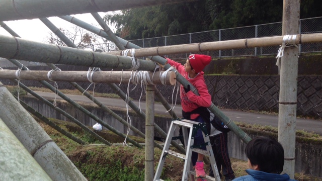 今日は公民館に残っている藁の移動と前回切り出していた竹の移動。そしてその竹を骨組みに結びつける作業までおこないました。