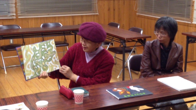 今日は、各自好きな絵本の紹介とビックブックでよみきかせの練習という流れで講座をすすめています。発声練習をして、今は各自の絵本紹介。