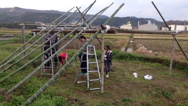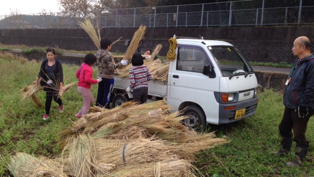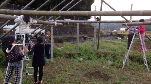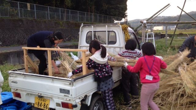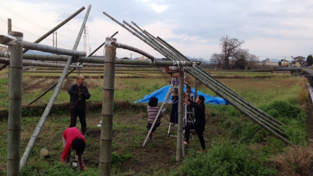いよいよ屋根の部分になる藁を公民館から移動させ、同じく屋根となる竹を柱にくくりつけます。