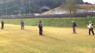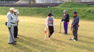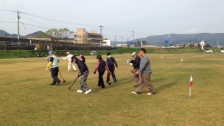 まずは3回目となる交流グラウンドゴルフ大会です。五和グラウンドゴルフ愛好会の皆さんと教室生。そして東部包括支援センターの職員安達さん(毎回必ず来てくれてます。皆勤賞です)、JAひたの職員の梶原さん(今日の午後からの大豆の収穫にあわせ、グラウンドゴルフにも参加してくれました)