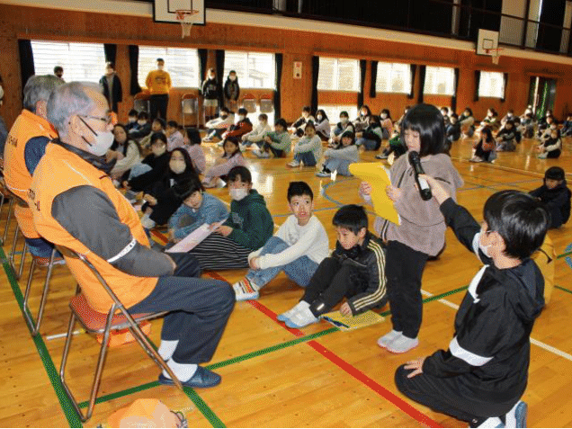石井小学校にて、スクールガードから代表して神田さんと吉田さん、お米作りでお世話になった江田さん、学校を綺麗にしてくださっているシルバー人材センターの小野さんへ寄せ書きを贈りました。