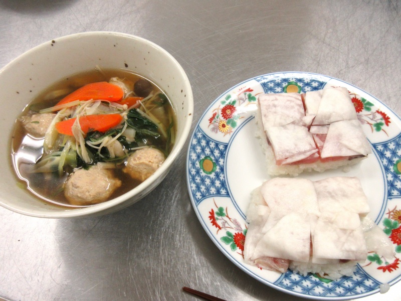 かぶら寿司がひんやりなので、あたたかく具沢山の鶏のつくね汁もいっしょにいただきました!