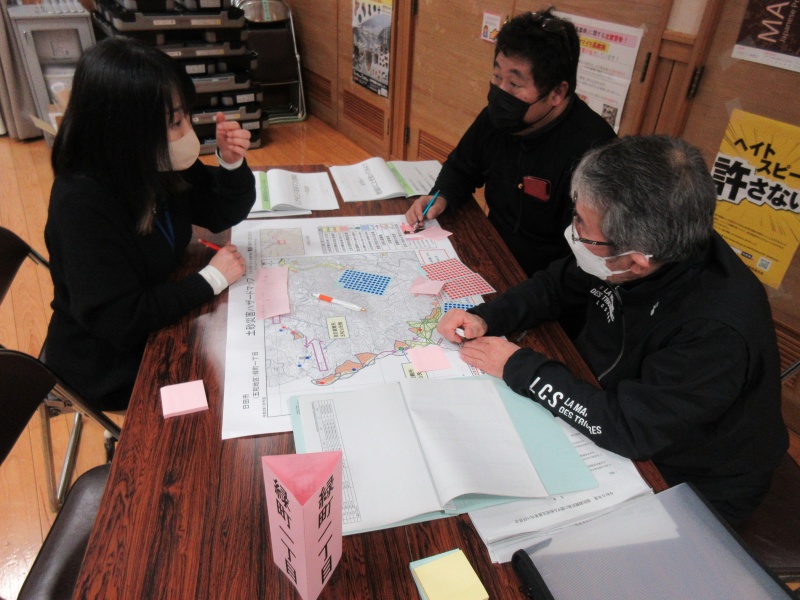 ハザードマップを活用しつつ、災害時に五和地区で起こるさまざまな困難に関して計画を考えました。