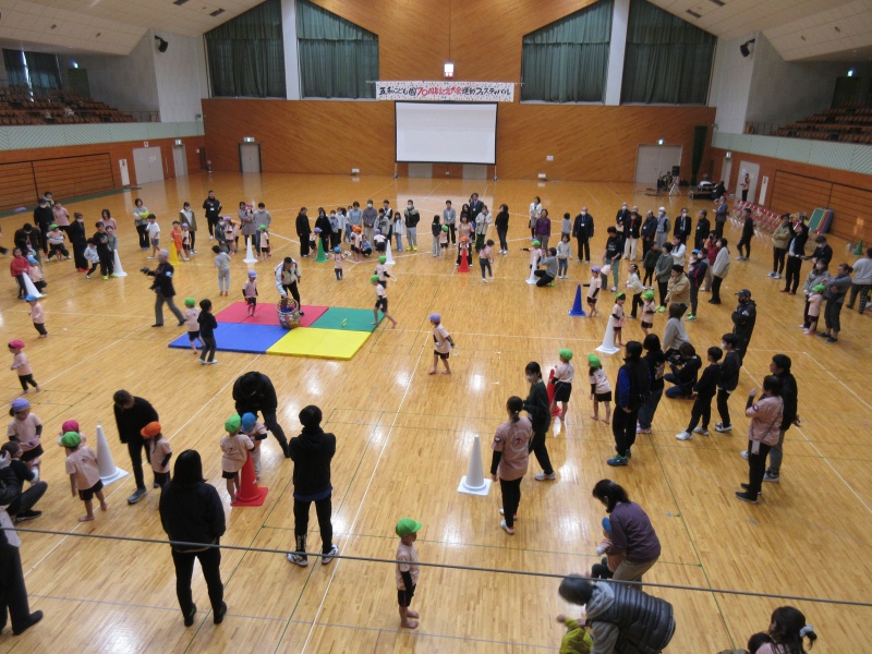 総合体育館にて開催。たくさんの来賓・保護者の方といっしょにゲームなどを行い、70周年を元気にお祝いしました。