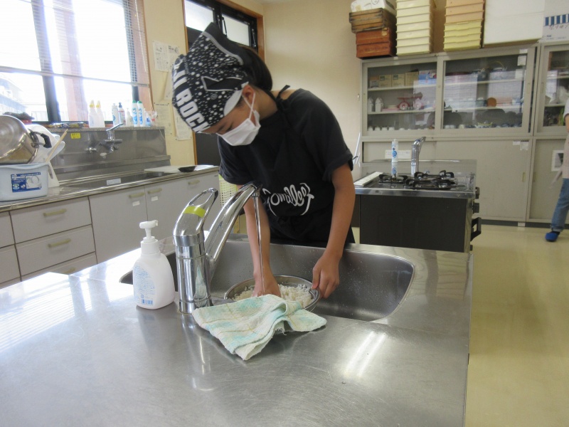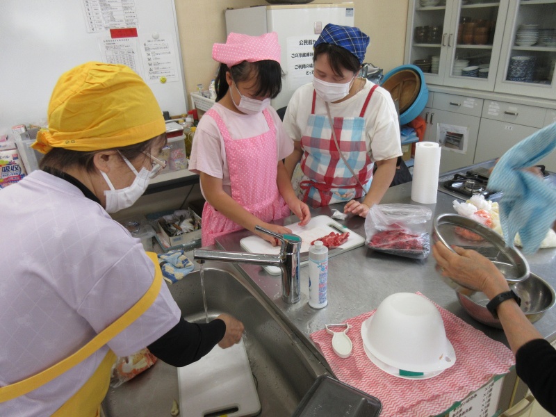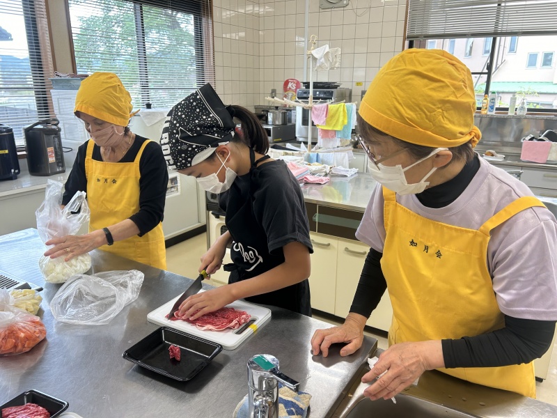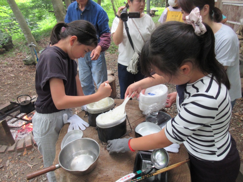 はじめに公民館調理室にて野菜切りなどの準備を行ってから、飯盒などの道具を準備して、