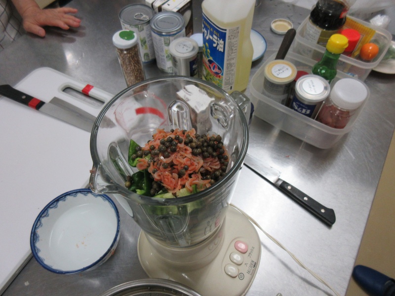 グリーンカレーはピーマンを大量にカットしミキサーに入れ、にんにく、しょうが、