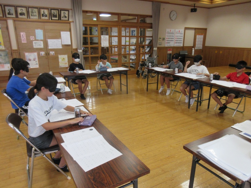 その後、アイマスクをしたまま白紙に自分の名前や学校名を書いてみました。