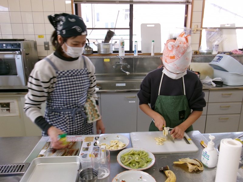 生地を冷やしている間に、イチゴやキウイ、バナナなどを切り、