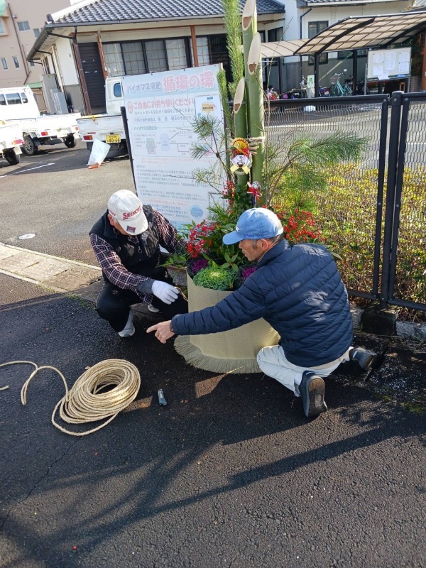 また、同じ日に公民館入り口の樽型鉢に、立派な門松を作製していただきました。