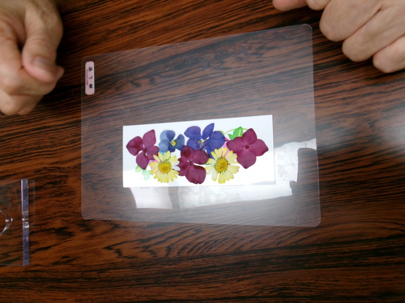 絵柄の入った下地にまずは押し花を上から置いていき、どのような絵柄に