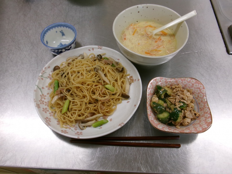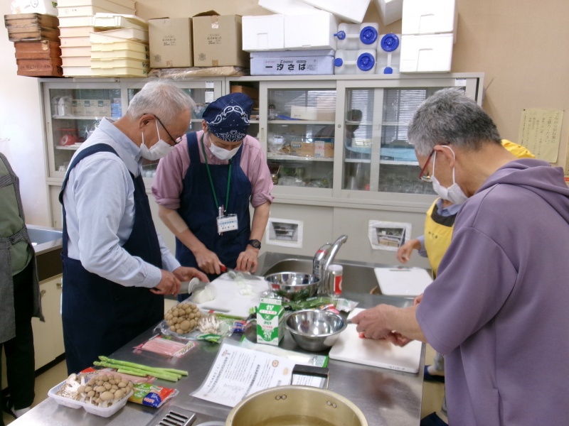 男の料理教室第1講【アスパラとベーコンのワンパンパスタ、豚肉ときゅうりのサラダ、ラクサ風春雨スープ】~R7.5.27~