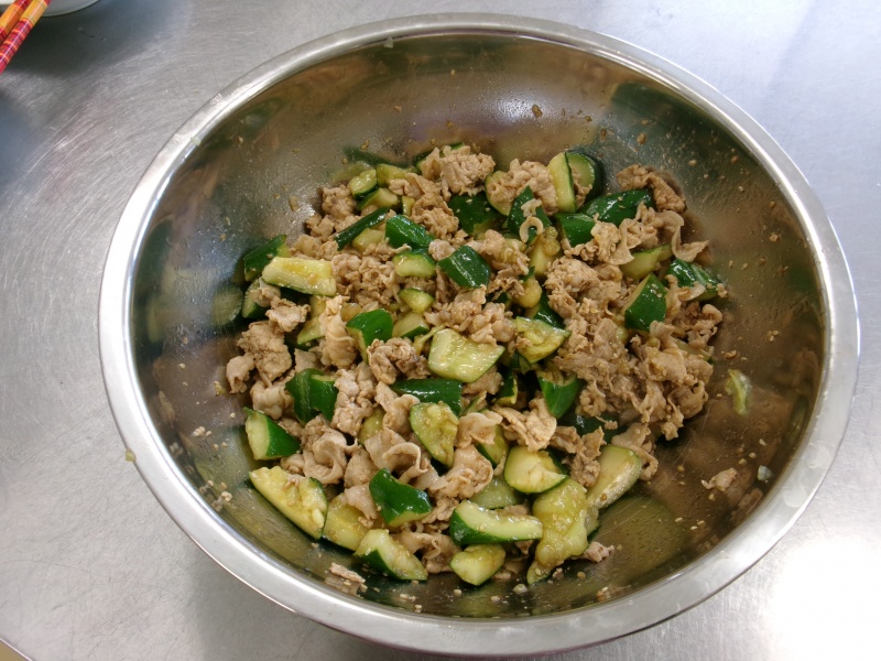 豚肉ときゅうりのサラダは、豚肉をサッとゆでておきます。キュウリはポリ袋に