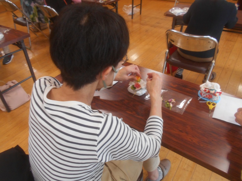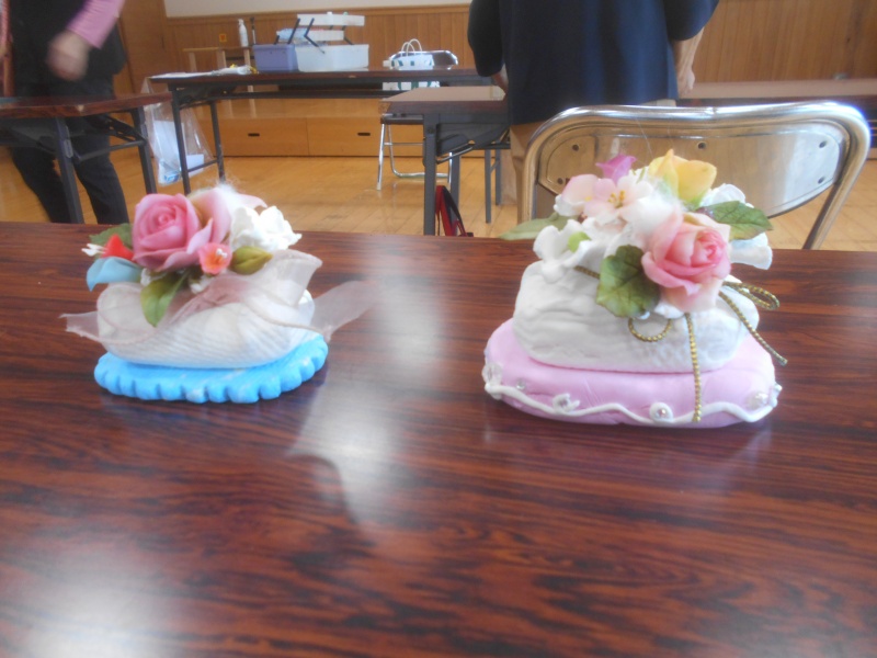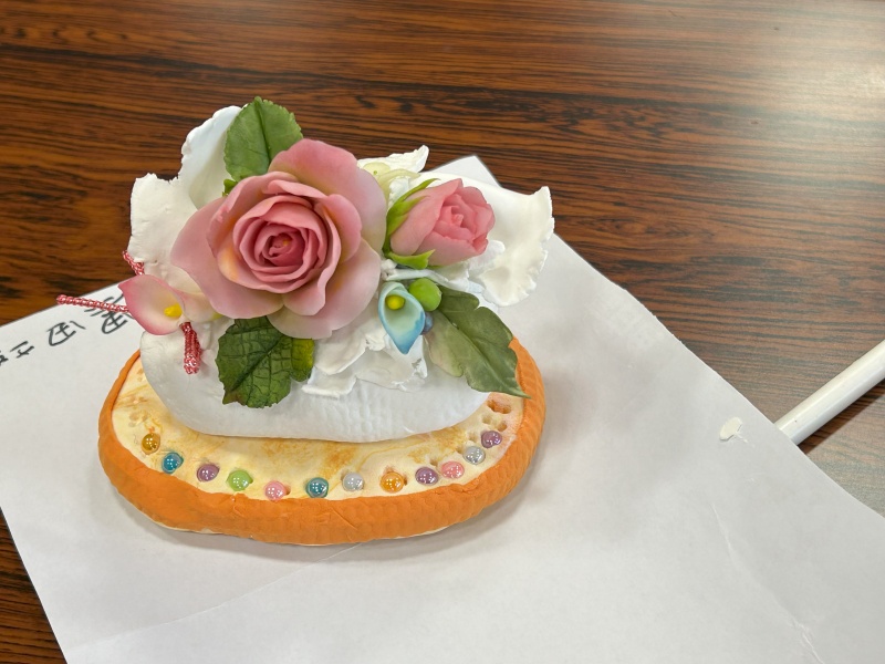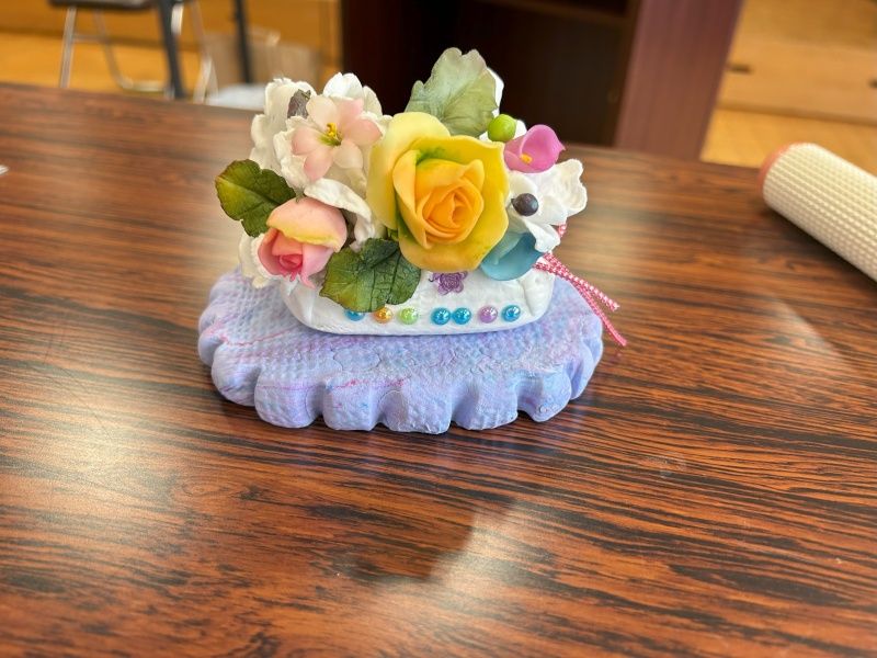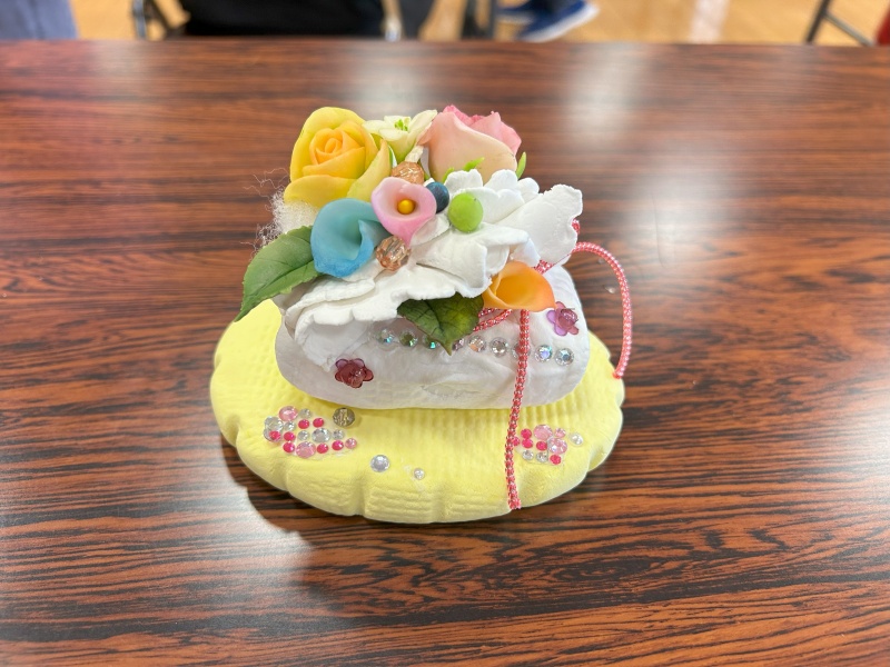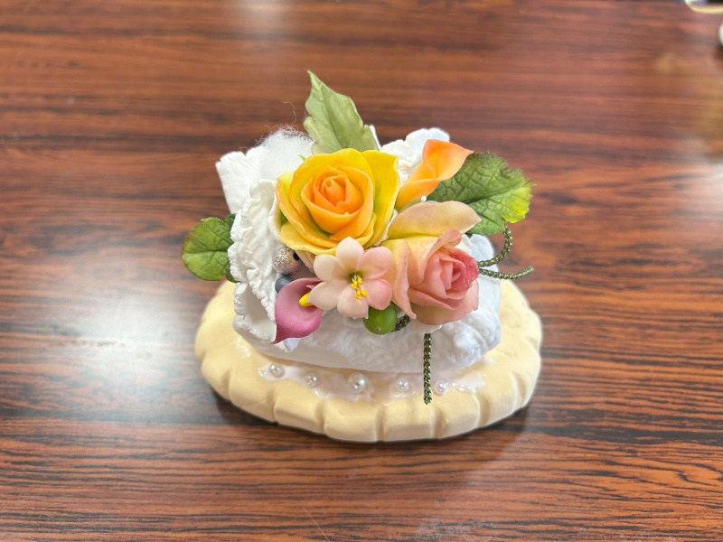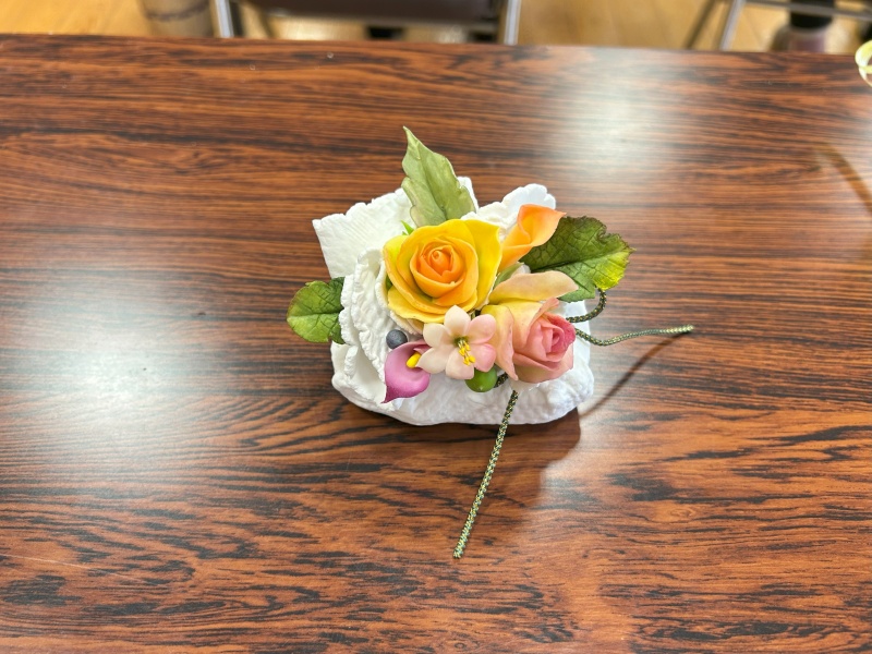 閉じたところにリボンをかけ、広げたところに、紙粘土で作った花を飾ります。