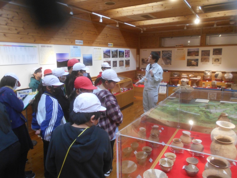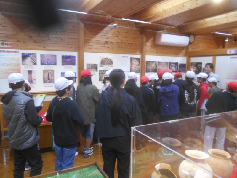 スクールバスで移動し、日田市埋蔵文化財センターで展示物の見学や実際に日田で出土した