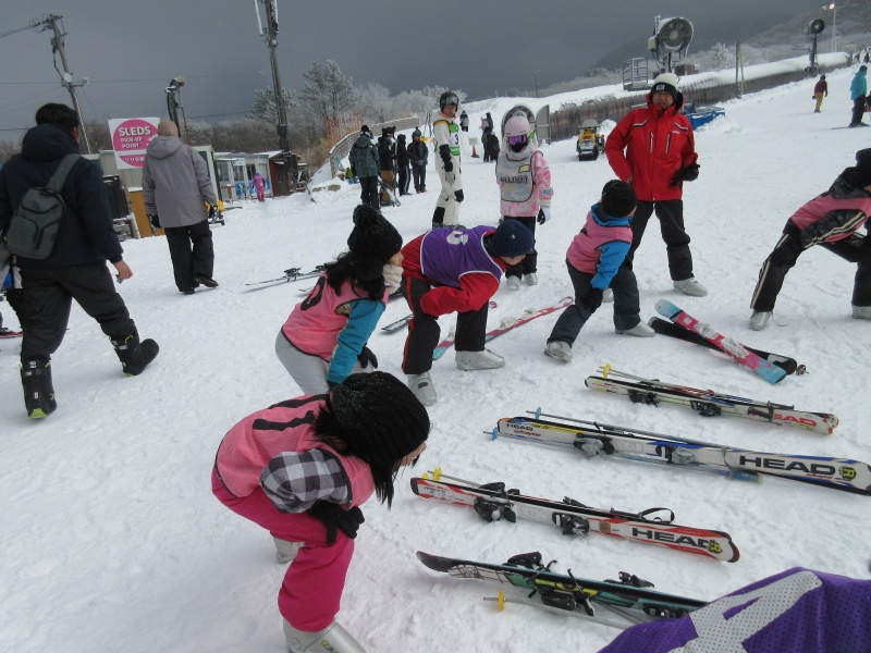 全員がスキーが初めてだったので、ウエアの着方の説明からはじめ